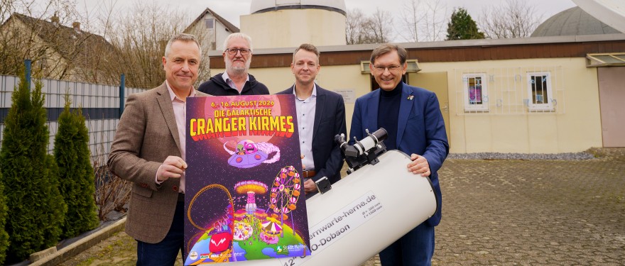 Das neue Kirmesplakat erzählt die Geschichte zweier Außerirdischer, die in einer fliegenden Untertasse zur Cranger Kirmes reisen. Rund 230 Tage bevor sich die Karussells offiziell wieder drehen, hat Oberbürgermeister Dr. Frank Dudda mit weiteren Beteiligten das neue Kirmesplakat in der Herner Sternwarte vorgestellt.