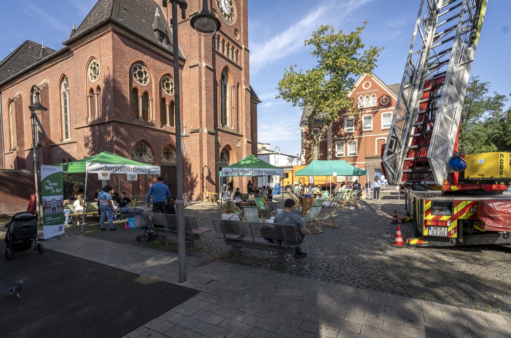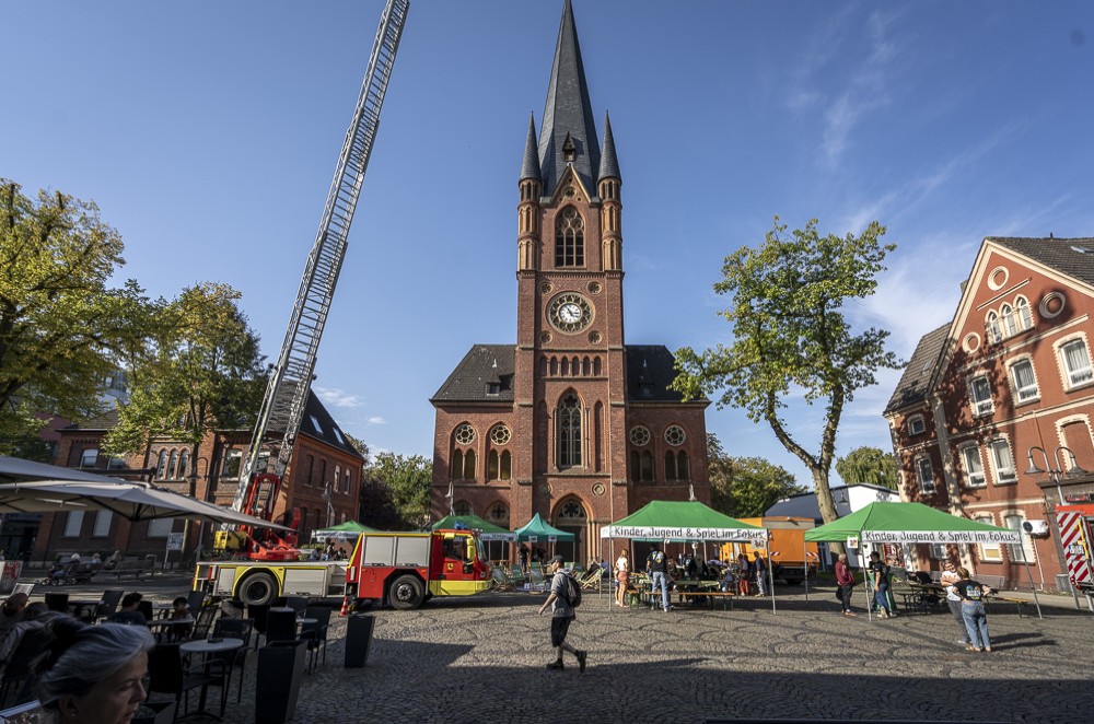 Die Herner Feuerwehr unterstützte das Fest mit spannenden Einblicken in ihre Fahrzeuge. Weithin sichtbar war die ausgefahrene Leiter samt Korb des Drehleiterfahrzeugs.