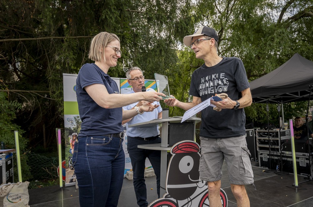 Ein weiterer Höhepunkt war die Ehrung der Sieger*innen des Stadtradelns 2025. Beim Stadtradeln treten Bürger*innen sowie Teams aus Schulen, Kitas, Vereinen und Unternehmen an, um in einem festgelegten Zeitraum möglichst viele Kilometer mit dem Fahrrad zurückzulegen. Ziel der Kampagne ist es, den Klimaschutz zu fördern, den Radverkehr voranzubringen und die Freude am Radfahren zu stärken. Herne war 2025 zum achten Mal dabei und das hervorragende Ergebnis des letzten Jahres konnte erneut übertroffen werden: Vom 24. Mai bis 13. Juni 2025 hieß es in Herne in die Pedale treten für ein gutes Klima. 1.554 Personen haben teilgenommen und 78 Teams haben sich zusammengeschlossen. Gemeinsam wurden 2025 knapp 240.000 Kilometer gefahren und somit 39 Tonnen CO2 gegenüber der Autonutzung vermieden – das entspricht der Länge von sechs Äquator-Umrundungen. Die besten Teams erhielten auf der Bühne von Stadtrat Stefan Thabe Urkunden, Schulen und Kitas zusätzlich Pokale.