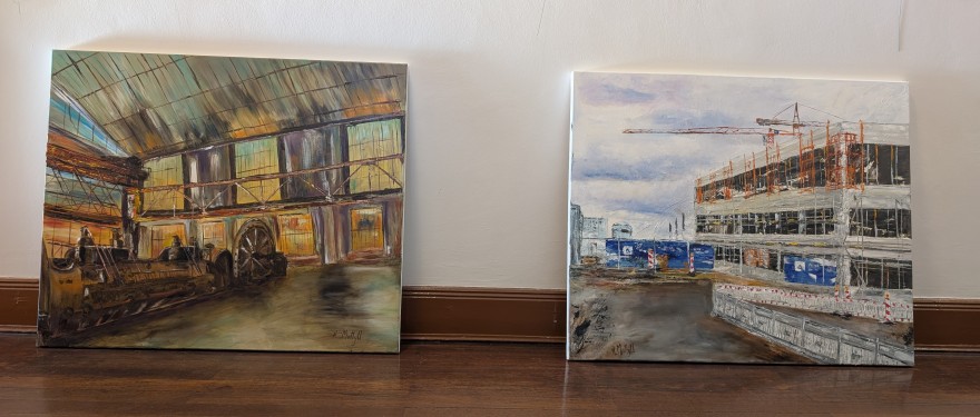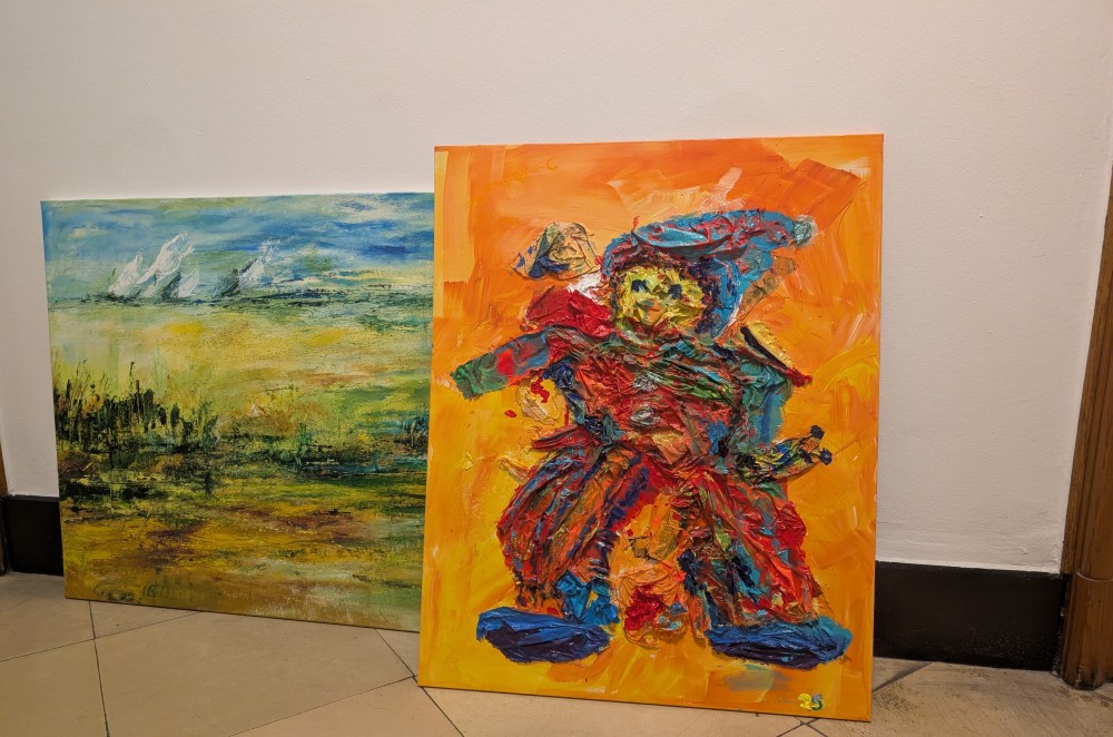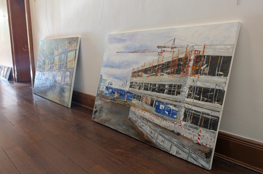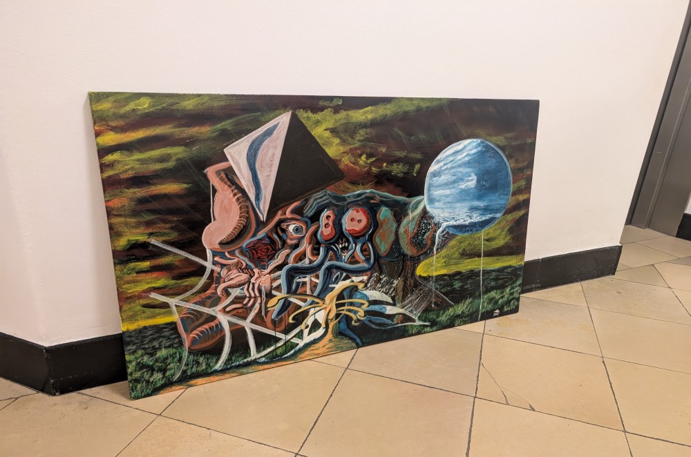 Die Ausstellung zeigt die Perspektiven erfahrener Künstler*innen und bietet neuen Talenten die Möglichkeit, sich einem breiten Publikum vorzustellen. Die Förderung junger Künstler*innen hat einen hohen Stellenwert im HKB. Einer von ihnen ist Sebastian Kaschner, er ist seit 2025 Mitglied im HKB. „Ich beschreibe meine Kunst als gestischen Surrealismus“, so Kaschner. Drei seiner Werke hängen im Erdgeschoss des Rathauses. Hier können sich Besuchende ein Bild vom „gestischen Surrealismus“ machen, zu dem nach Auskunft von Kaschner „noch keinen Wikipedia-Eintrag gibt.“