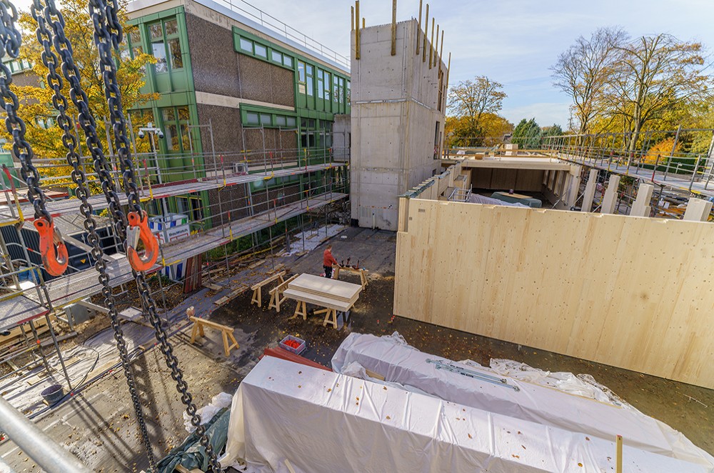 So können jetzt bereits die Decken des Erdgeschosses verschlossen werden. Der Erweiterungsbau entsteht als Holz-Hybridbau mit Holz-Beton-Verbunddecken. In Zukunft wird er den Bedarf an Fachräumlichkeiten an der Quinoa-Schule decken. Die Fertigstellung ist für Sommer 2026 geplant, die Gesamtinvestition beläuft sich auf 8,2 Millionen Euro.