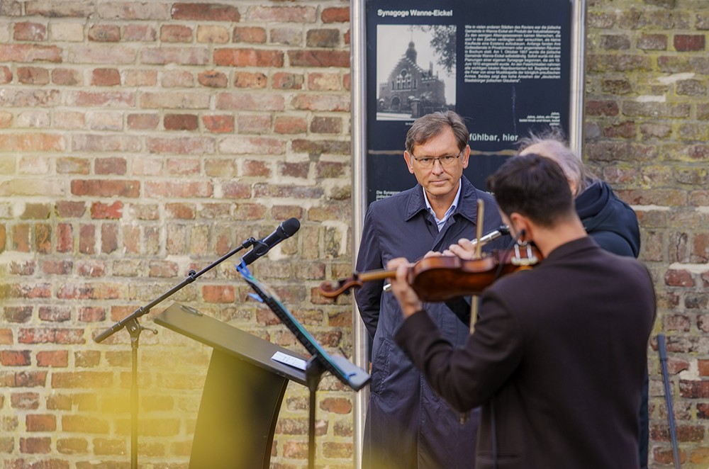 Oberbürgermeister Dr. Frank Dudda zeigte sich besonders erfreut, dass viele Schüler*innen dem Aufruf zu der Gedenkveranstaltung gefolgt waren. Unter den zahlreichen Gästen waren zudem Vertreter*innen verschiedener Religionen, der Politik, der Verwaltung und aus weiteren gesellschaftlichen Gruppen, um zu erinnern und ein Zeichen gegen Gewalt, Hass und Ausgrenzung in der Gesellschaft zu setzen. Den musikalischen Rahmen für das Gedenken setzte – wie auch im vergangenen Jahr – eine Band der Gesamtschule Wanne-Eickel.