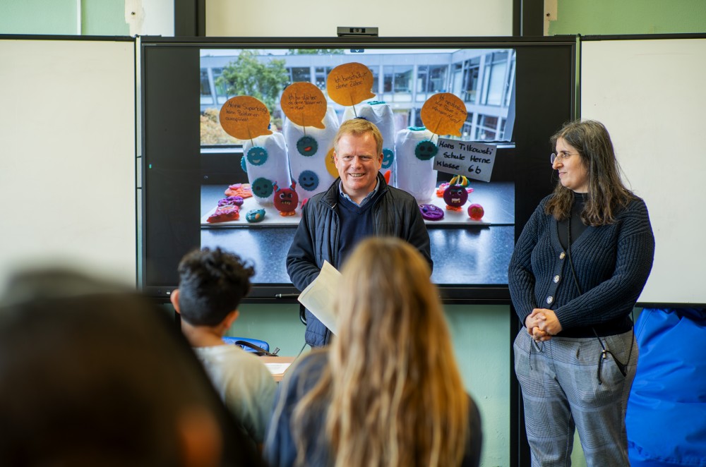 Den ersten Platz des Wettbewerbs sicherte sich die Klasse 6b der Hans-Tilkowski-Schule. Am Donnerstag, 13. November 2025, fand im Klassenraum die Siegerehrung statt. „Ihr könnt unheimlich stolz auf Eure Leistung sein“, lobte Schuldezernent Andreas Merkendorf und verkündete gleichzeitig die Höhe des Preisgeldes von 300 Euro. Die Schüler*innen wollen davon einen Ausflug machen. Ebenfalls anwesend war Birsel Habrichi-Pulat, Fachzahnärztin für öffentliches Gesundheitswesen und Vorsitzende des Arbeitskreises Zahngesundheit Herne. Sie erklärte den Sechstklässlern die positiven Eigenschaften von Speichel. „Spucke ist ein Supermittel, das die Zähne beschützt und Bakterien abtötet. Sie unterstützt die Wundheilung im Mund und hilft beim Essen. Eine echte Superkraft eben.“ Die Schüler*innen hatten eine sehenswerte Skulptur geschaffen mit Zähnen aus PET-Flaschen und Bakterien aus Knete.