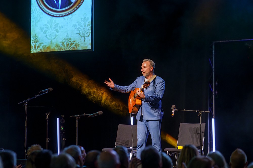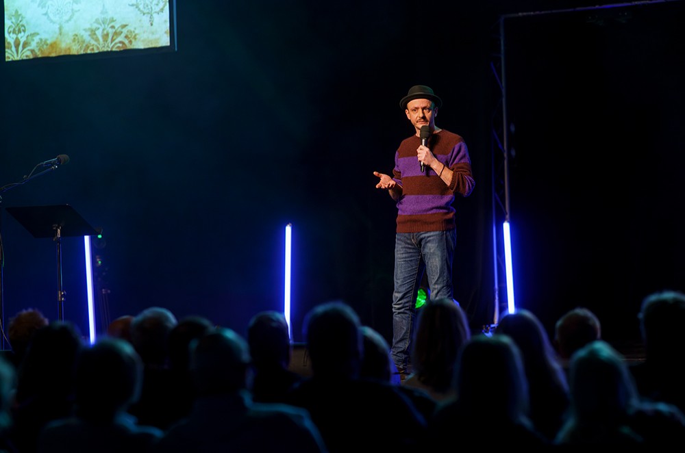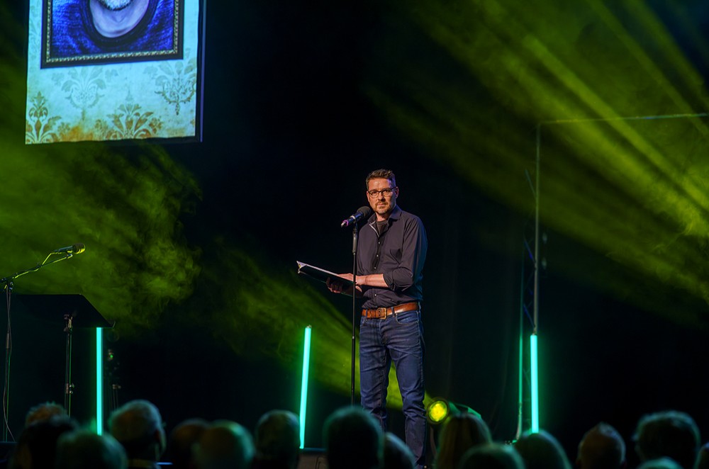 Oberbürgermeister Dr. Frank Dudda überreichte den Publikumspreis an Sascha Thamm. Das Publikum konnte in der Pause online oder per Stimmkarte entscheiden. „Wir haben 620 Stimmen bekommen, man brauchte 339 Stimmen, um diese wunderbare Ehrung zu erhalten. Meine Damen und Herren, gratulieren Sie dem diesjährigen Sieger des Publikumspreises der Stadt Herne“, so das Stadtoberhaupt. Sascha Thamm freute sich: „Vielen herzlichen Dank und Sie glauben gar nicht, was das für mich bedeutet.“ In seiner Familie wären früher oft Tegtmeier-Schallplatten gelaufen. „Es gibt viele Tegtmeier-Zitate, die in meiner Familie geflügelte Worte waren“, sagte der Preisträger in seiner Dankesrede.