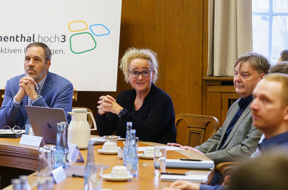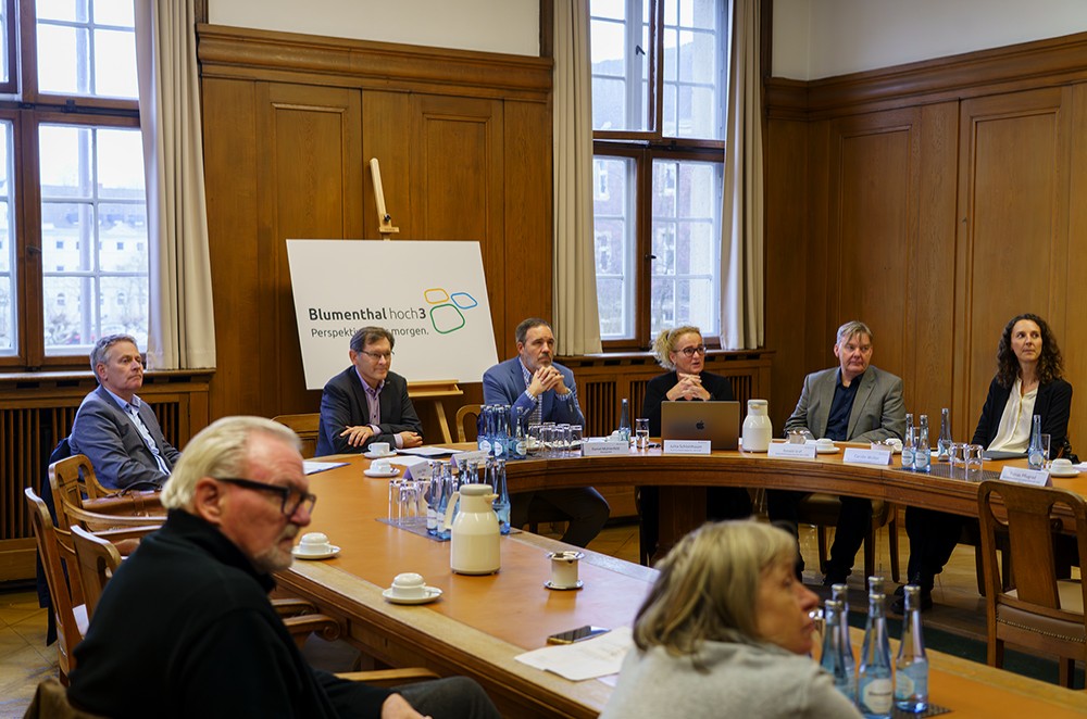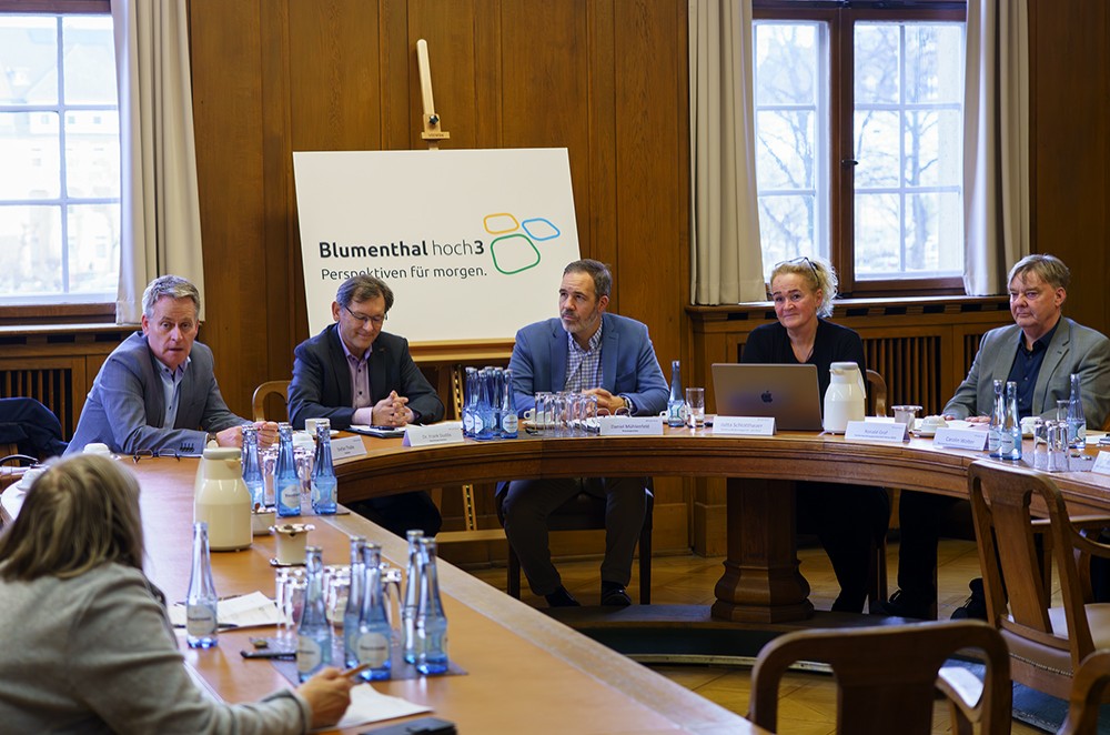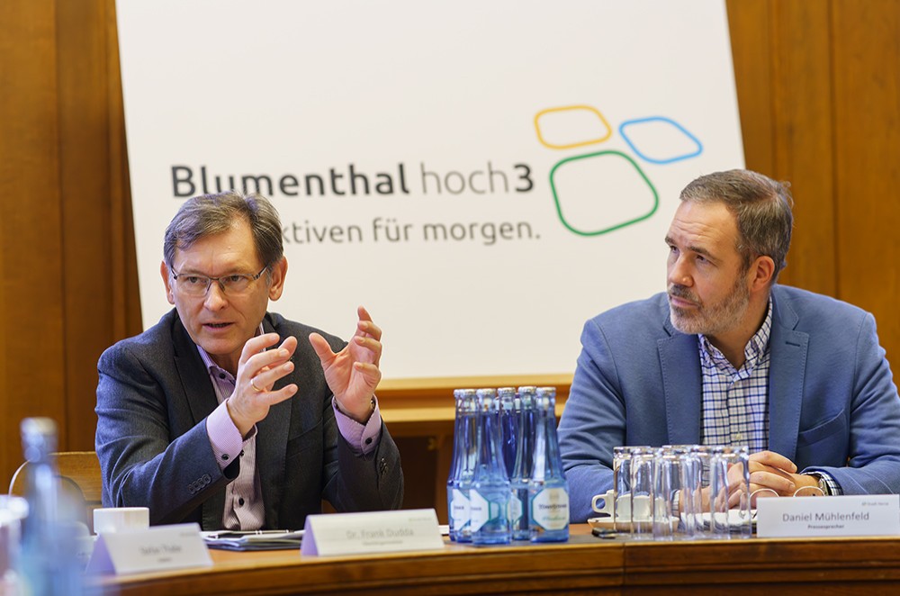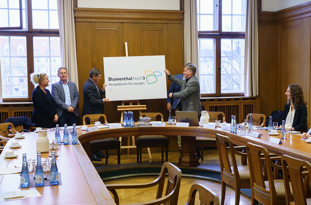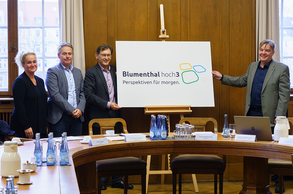 Das Stadtentwicklungsprojekt Blumenthal tritt künftig unter der Wort-Bild-Marke „Blumenthal hoch3“ auf. Gemeinsam mit der Kommunikationsagentur „dot.blue“, welche die Entwicklung der Marke verantwortet, stellten Oberbürgermeister Dr. Frank Dudda und Ronald Graf, Geschäftsführer der städtischen Blumenthal-Entwicklungsgesellschaft mbH (BEG), den Medien heute die Marke und ihre grafische Gestaltung vor.