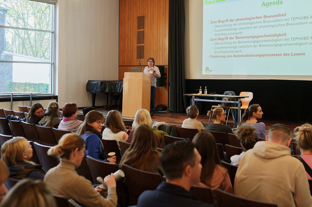Der Vortrag erläuterte zunächst die Bedeutung der phonologischen Bewusstheit, der Fähigkeit, Laute in Wörtern zu erkennen, für den Schriftspracherwerb. Als weiteres wichtiges Kriterium für die erfolgreiche Aneignung des Lesens und Schreibens wurde dann die Benennungsgeschwindigkeit thematisiert, welche angibt, wie schnell man bekannte Objekte, wie beispielsweise Zahlen oder Farben, benennen kann. Entsprechende Testverfahren zur Früherkennung dieser Risikofaktoren wurden von Prof. Dr. Andreas Mayer vorgestellt.