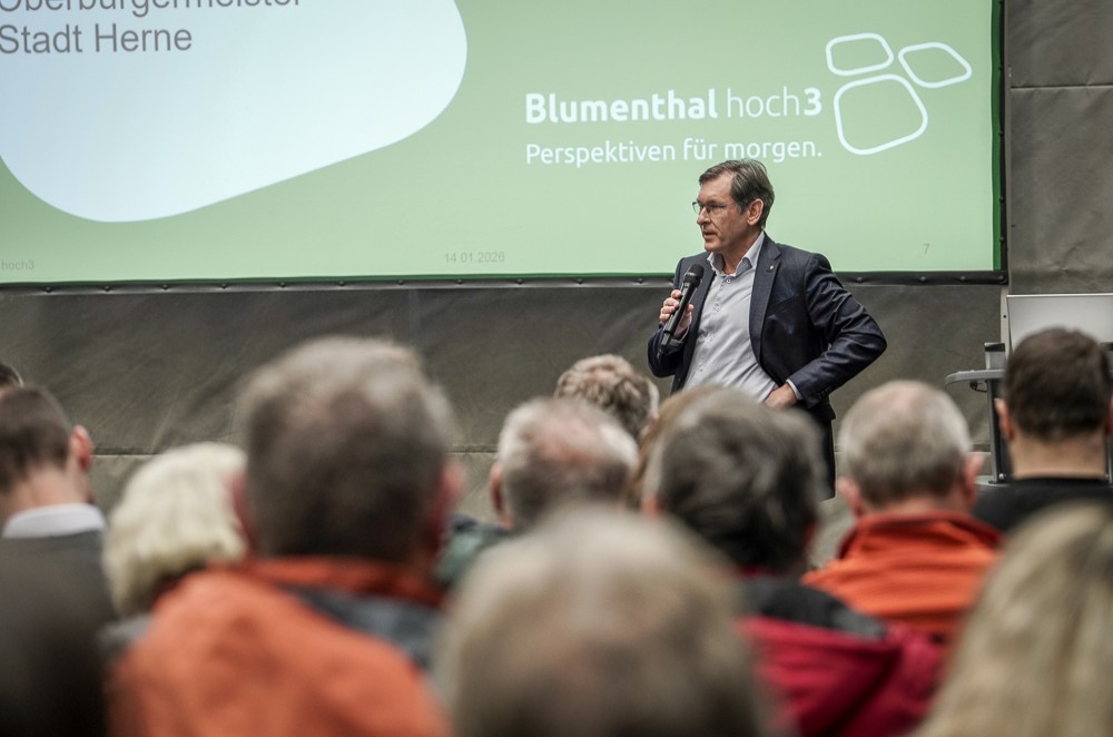 Durch die Veranstaltung führte eine professionelle Moderation. Eingangs des Abends gaben Vertreter*innen der Stadt und der städtischen Projektentwicklungsgesellschaft zunächst einen Einblick in den derzeitigen Stand des Projekts: „Wir haben jüngst präsentiert bekommen, welche enormen wirtschaftlichen Effekte die Entwicklung des FunkenbergQuartiers für Herne entfalten kann. Wir dürfen also guter Hoffnung sein, dass auch Blumenthal hoch3 sich entsprechend positiv auswirken wird“, so Oberbürgermeister Dr. Frank Dudda in seinem Grußwort.
