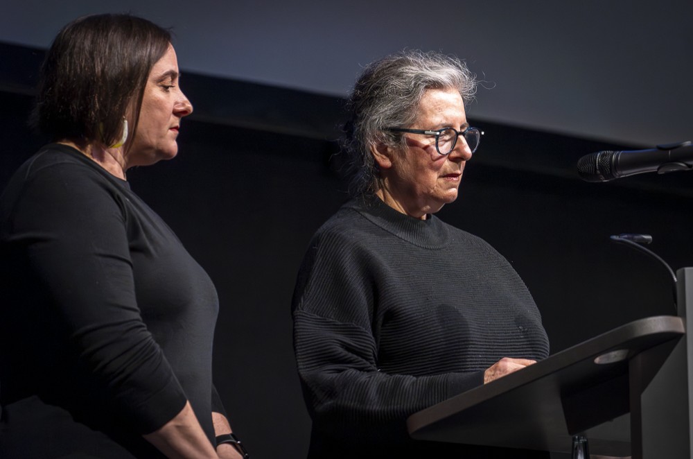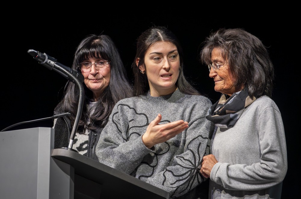 Im Anschluss an die Rede des Oberbürgermeisters wurde das Projekt „Stolpersteine“ vorgestellt, welches nun auch in Herne an fünf Erinnerungsorten umgesetzt wird. Dafür kam zunächst Diane Mossenson mit ihrer Tochter Talya auf die Bühne. Diane ist Enkelin der Familie Hecht und lebt in Perth, Australien. Sie schilderte mit eindringlichen Worten die Kindheit ihrer Mutter in Herne, ihre Rede wurde von Pat van den Brink auf Deutsch übersetzt. „Der Holocaust begann nicht mit Lagern und Massenmord. Er begann mit Kindheiten wie der meiner Mutter, in denen Ausgrenzung alltäglich war, Grausamkeit akzeptiert wurde. Er begann mit Schweigen, mit kleinen Veränderungen im alltäglichen menschlichen Verhalten. Völkermord beginnt nicht mit Gewalt, er beginnt mit Gedanken und Worten. Er vollzieht sich schrittweise, bis er plötzlich eintritt“, sagte Diane Mossenson.