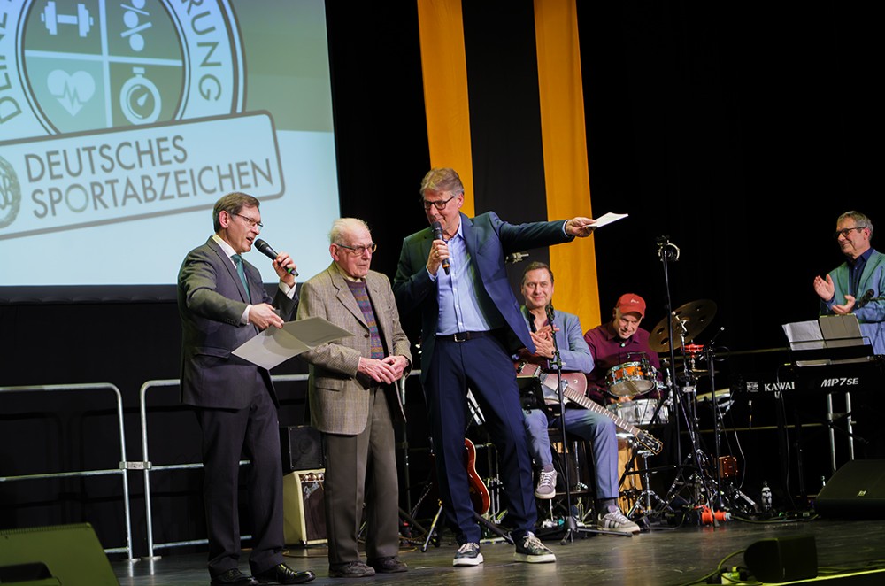 Zu den bewegenden Momenten der Veranstaltung gehörte die Auszeichnung von Johann Otte für den Erwerb des 60. Sportabzeichens. "Auf die alten Tage wird man noch bekannt", freute sich der Hundertjährige, der seit 1966 jedes Jahr das Sportabzeichen macht und dessen Lieblingsdisziplin das Laufen ist. Durch seine Leistung inspiriert, ließ sich Moderator Großmann überreden, seinerseits für das Sportabzeichen zu trainieren. Beindrucken konnte auch der Erfolg von Maik Bernhard mit dem ersten Platz bei der Mixed-Wertung beim Trans Alpine Run. Dort lief der Mitarbeiter der Stadt Herne sieben Tage hintereinander durchschnittlich 30 bis 50 Kilometer.