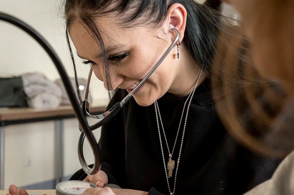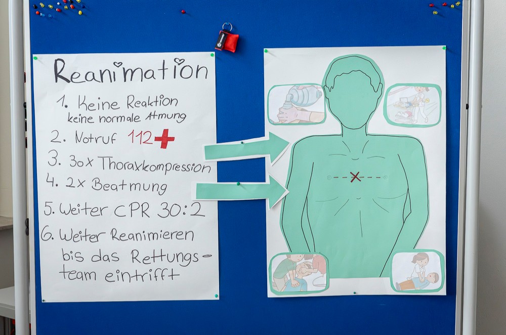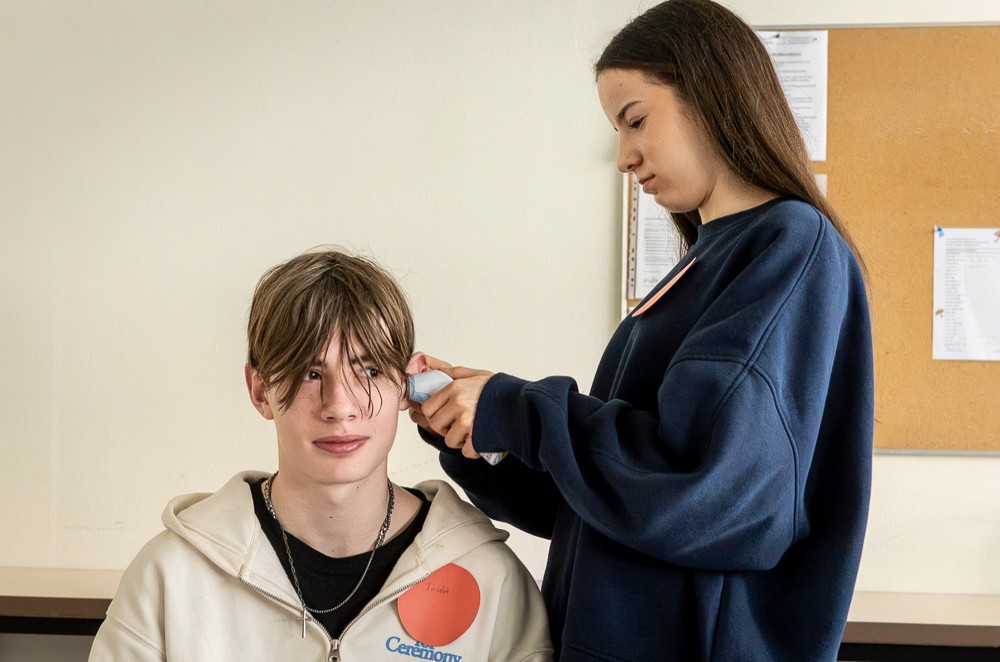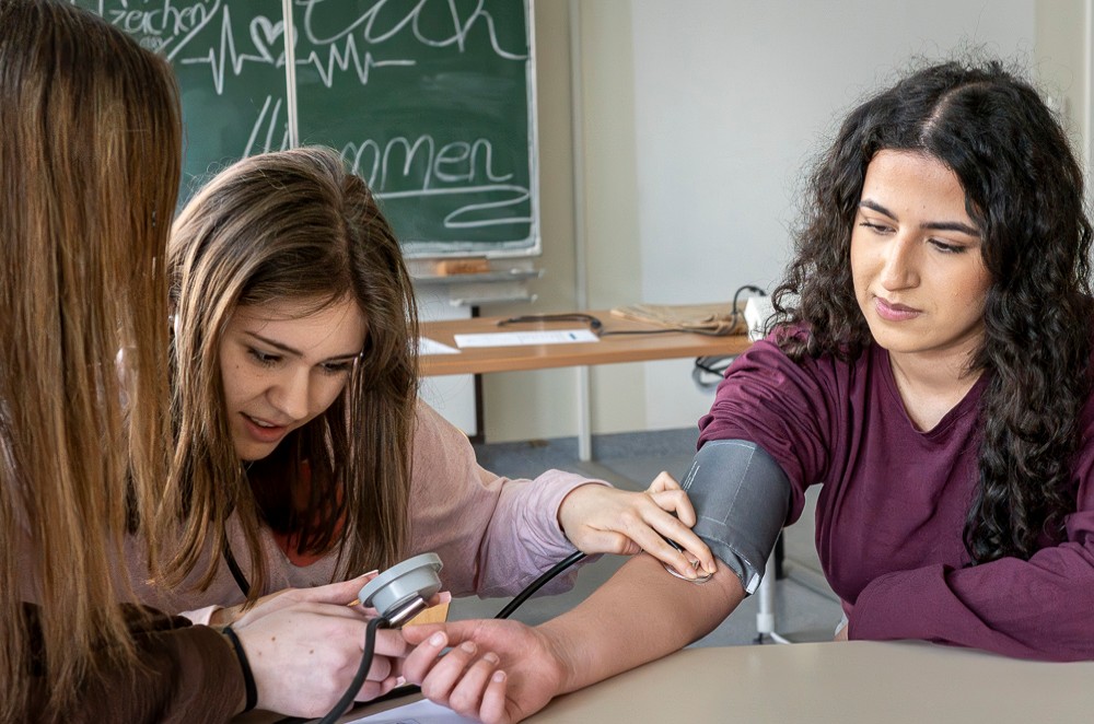 Um neun Uhr trafen sich die Schüler*innen der Erich-Fried Gesamtschule am Eingang der Pflegefachschule in der Düngelstraße 26, um einen Schultag lang die Arbeit in der Pflege kennenzulernen. Nach der Begrüßung durch die zuständige Lehrkraft Sandra Lopez-Anaya absolvierten die Jugendlichen einen Parcours mit verschiedenen Stationen. Dadurch konnten sie praktische Fähigkeiten, wie das richtige Vorgehen beim Desinfizieren der Hände oder das Messen von Vitalzeichen erlernen, die Teil des Arbeitsalltags in der Pflege sind.
