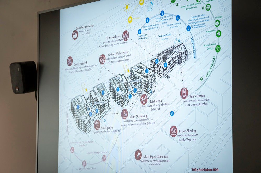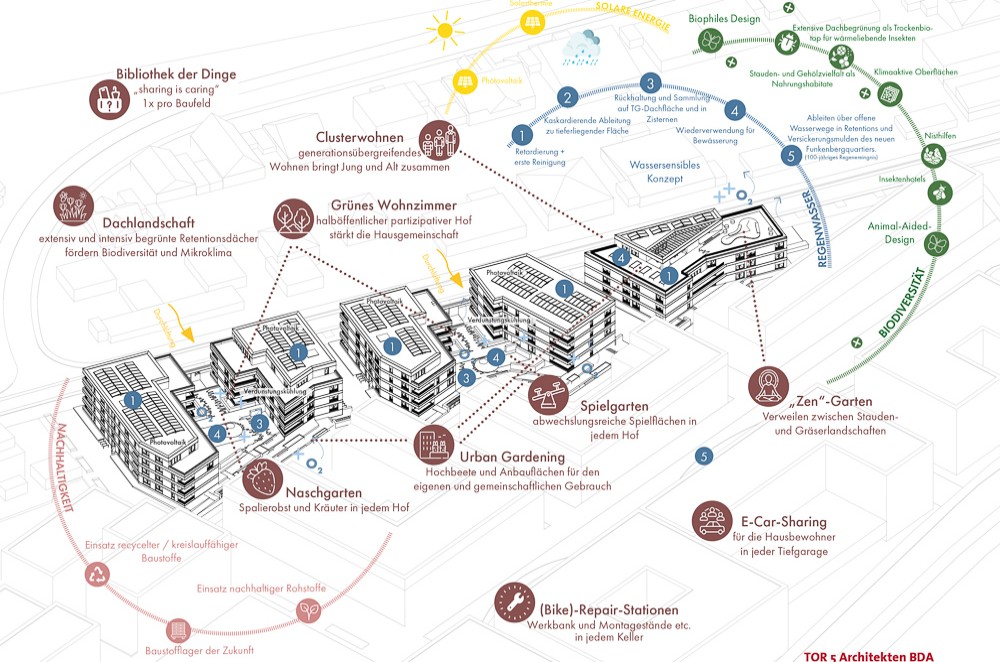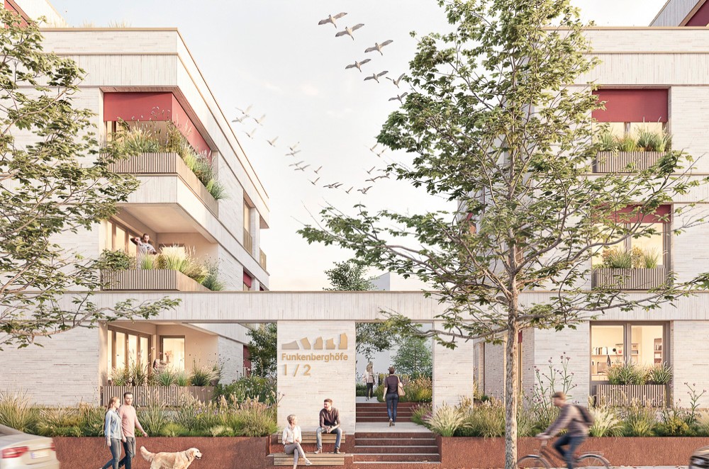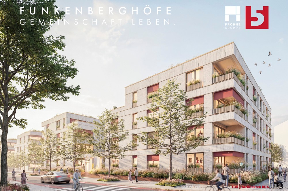 Aus Sicht des Architekturbüros TOR5 Architekten kann das Planungsgebiet vor allem mit seiner Zentralität und fußläufigen Nähe zu Innenstadt und Bahnhof punkten: "Eine solche Lage ist hochattraktiv. Insofern war es eine reizvolle Aufgabe, die Fläche mit einem Mischkonzept aus frei vermarktetem und öffentlich geförderten Wohnraum zu entwickeln und dies zugleich in die gestalterische Gesamtentwicklung des FunkenbergQuartiers einzupassen", so die Annabel Mosenthin und Herfried Langer, Architektin und Architekt bei TOR5.