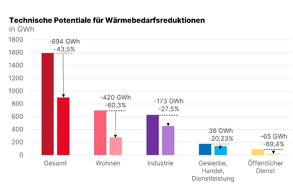 Bei einer umfassenden Sanierung aller Gebäude und der Umsetzung weitergehender Effizienzmaßnahmen ließe sich der Wärmebedarf theoretisch um rund 44 Prozent reduzieren. In der Praxis werden jedoch neben den möglichen Einsparungen auch die Kosten berücksichtigt, sodass das wirtschaftlich realisierbare Potenzial geringer ausfällt. Dieses wird im Rahmen des Zielszenarios abgeschätzt.