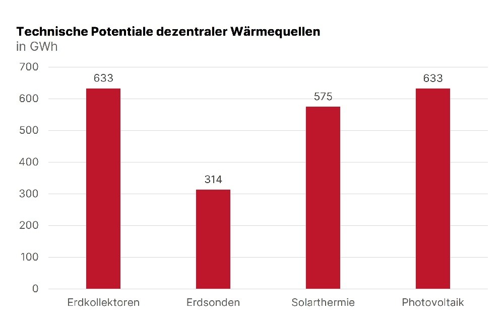 Das technische Potenzial dezentraler Wärmequellen umfasst in Herne insbesondere Wärme aus Erdkollektoren, Erdsonden, Solarthermie sowie Photovoltaik-gestützten Wärmepumpensystemen. Diese Potenziale übersteigen die künftig benötigte Wärmemenge um ein Vielfaches, sind jedoch durch verfügbare Flächen sowie geologische und bauliche Bedingungen begrenzt. Das Potenzial von Luft-Wärmepumpen wird dagegen als nahezu unbegrenzt eingeschätzt, da sie keinen zusätzlichen Flächenbedarf haben und flexibel einsetzbar sind; allerdings sind hier Geräuschemissionen bei der Standortwahl zu berücksichtigen. Insgesamt zeigt die Gegenüberstellung, dass ausreichend dezentrale Optionen für eine klimaneutrale Wärmeversorgung vorhanden sind.