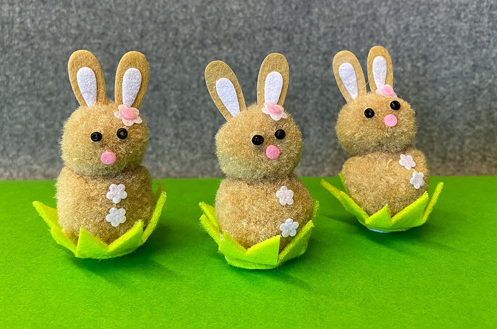 Aus brauner beziehungsweise grauer Tonpappe zwei Hasenohren ausschneiden und mit etwas Klebstoff am Hasenkopf befestigen. Wackelaugen oder schwarze Knöpfe aufkleben, fertig ist der Bommel-Osterhase!