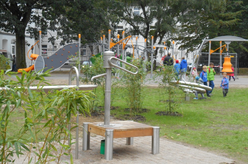 Um die Fläche wieder modern, ansprechend und attraktiv zu gestalten und die Angebote an die Wünsche und Vorstellungen der unterschiedlichen Altersgruppen anzupassen, wurde im Rahmen der Maßnahmenplanung von Mai bis September 2015 eine zweistufige Beteiligung mit Kinder und Jugendlichen sowie den Anwohnern und weiteren Interessierten durch- geführt. Das Beteiligungsverfahren wurde durch die Kinderanwältin Bibi Buntstrumpf, die Stadtverwaltung und das Stadtumbaumanagement fachlich begleitet. Als Ergebnis der Neuplanung wurde die Grünfläche in Bereiche aufgeteilt, in denen sich Angebote für die unterschiedlichen Ziel- und Altersgruppen wieder finden: Im Jahr 2016 sind so ein Kleinkindbereich, ein Aktiv- und Sportbereich sowie ein Aufenthaltsbereich mit verschiedenen Spielgeräten entstanden. Weiterhin wurde die Wegeführung neu und gradlinig gestaltet und mit einer Beleuchtung ausgestattet. An verschiedenen Stellen sind Sitz- und Verweilmöglichkeiten geschaffen und die Eingangs-bereiche zur Grünanlage ansprechend gestaltet worden.
