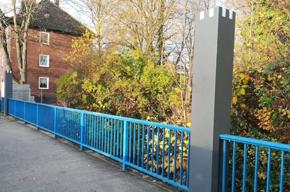 Ein Teil der im Quartier gelegenen Brücken wird sukzessive umgestaltet / neu gebaut. Die Gestaltung folgt dabei einem einheitlichen, mit den Bürger*innen gemeinsam erarbeiteten Konzept, welches die Brücken entlang des Dorneburger Mühlenbachs gestalterisch miteinander verbinden soll. Elemente mit Wiedererkennungswert, wie Infostelen mit lokalen historischen Informationen, blau gestrichene Geländer sowie eine LED-Beleuchtung am Handlauf heben die Brücken hervor und werten sie auf. Die Infostele auf der Brücke gibt Informationen zur Renaturierung des Dorneburger Mühlenbachs.